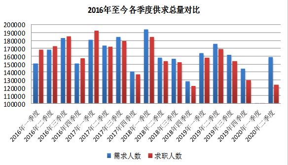 2020年二季度,各类用人单位通过市、区两级公共就业服务机构招聘人员159182人,同期进入市场寻找工作的求职人员共有123839人,求人倍率为1.29,人力资源市场呈现出需求人数多于求职人数的态势。与上季度相比,需求人数和求职人数分别增加了65144人和64566人,增幅分别为69.27%和108.93%;与去年同期相比,需求人数和求职人数分别减少了16803人和45386人,降幅分别为9.55%和26.82%。求人倍率较上季度下降了0.3个百分点,较去年同期上升了0.25个百分点。