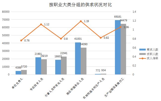 从供求状况对比看,商业和服务业人员、专业技术人员供不应求的矛盾较为突出,求人倍率分别为1.19和1.12。