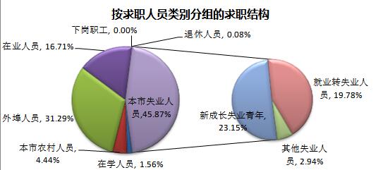 从求职人员的类别看,本地失业人员和外埠人员是两大求职主力,分别占求职总量的47.3%和39.85%,本市农村人员占6.31%、在业人员占5.44%。与上季度和去年同期相比,外埠人员的求职比重分别上升了1.46和2.02个百分点,新成长失业青年的求职比重略有下降,但其中应届高校毕业生所占比重呈现上升趋势,在业人员求职比重略有下降。