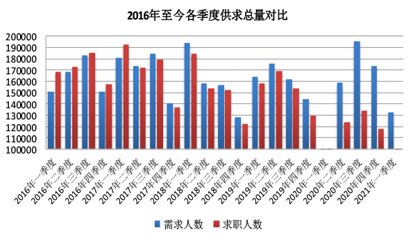 2021年一季度,各类用人单位通过市、区两级公共就业服务机构招聘人员132195人,同期进入市场寻找工作的求职人员共有88410人,求人倍率为1.50,人力资源市场呈现出需求人数多于求职人数的态势。与上季度相比,需求人数和求职人数分别减少了41136人和29665人,降幅分别为23.73%和25.12%;与去年同期相比,需求人数和求职人数分别增加了38157人和29137人,增幅分别为40.58%和4.16%。受到去年年初新冠肺炎疫情的影响,同期需求人数和求职人数的增幅都较大。