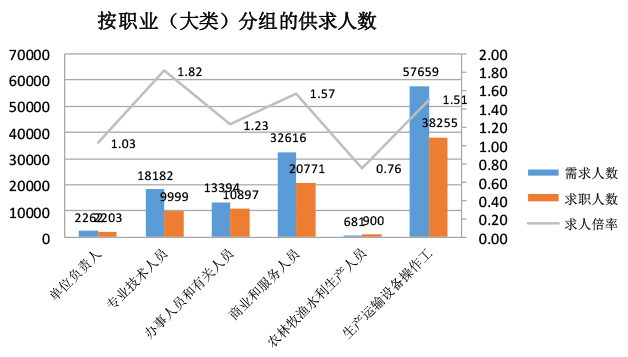 从供求状况对比看,专业技术人员、商业和服务业人员供不应求的矛盾较为突出,求人倍率分别为1.82和1.57。
