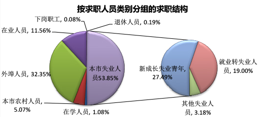 从求职人员的类别看,本地失业人员和外埠人员是两大求职主力,分别占求职总量的53.85%和31.83%,本市农村人员占6.83%、在业人员占6.13%外埠人员的求职比重较上季度下降了0.52个百分点,较去年同期上升了2,56个百分点。新成长失业青年的求职比重有所下降。