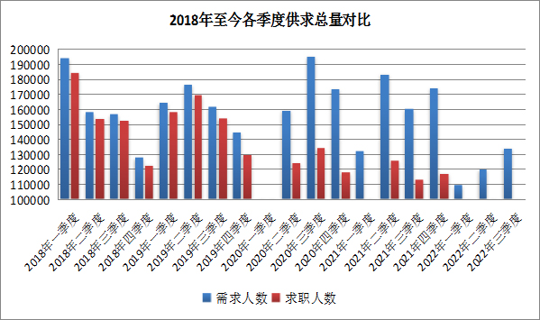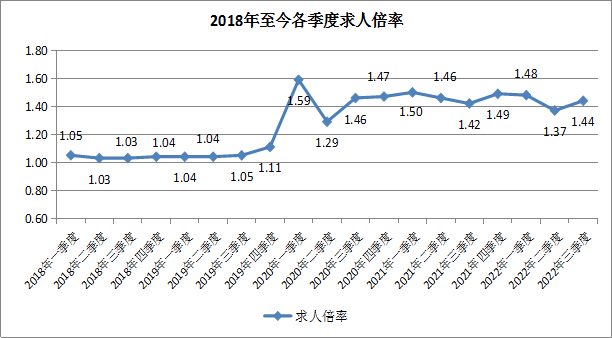 2022年三季度,各类用人单位通过市、区两级公共就业服务机构招聘人员133901人,同期进入市场寻找工作的求职人员共有92906人,求人倍率为1.44,人力资源市场呈现出需求人数多于求职人数的态势。与上季度相比,需求人数和求职人数分别增加了14189人和5771人,增幅分别为11.85%和6.62%;与去年同期相比,需求人数和求职人数分别减少了26438人和19977人,降幅分别为16.49%和17.70%。