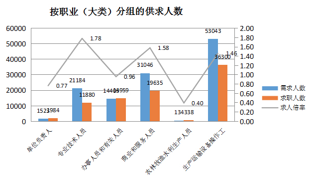 从供求状况对比看,专业技术人员、生产运输设备操作工供不应求的矛盾较为突出,求人倍率分别为1.78和1.46。