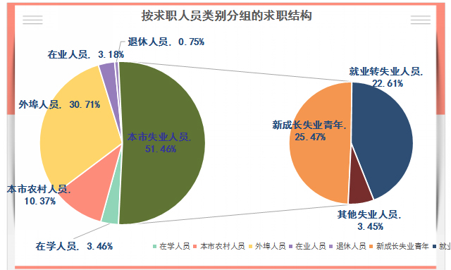 从求职人员的类别看,本地失业人员和外埠人员是两大求职主力,分别占求职总量的51.46%和30.71%,本市农村人员占10.37%、在业人员占3.18%。,外埠人员的求职比重较去年同期下降了8.28个百分点.较上季度上升了1.56个百分点。