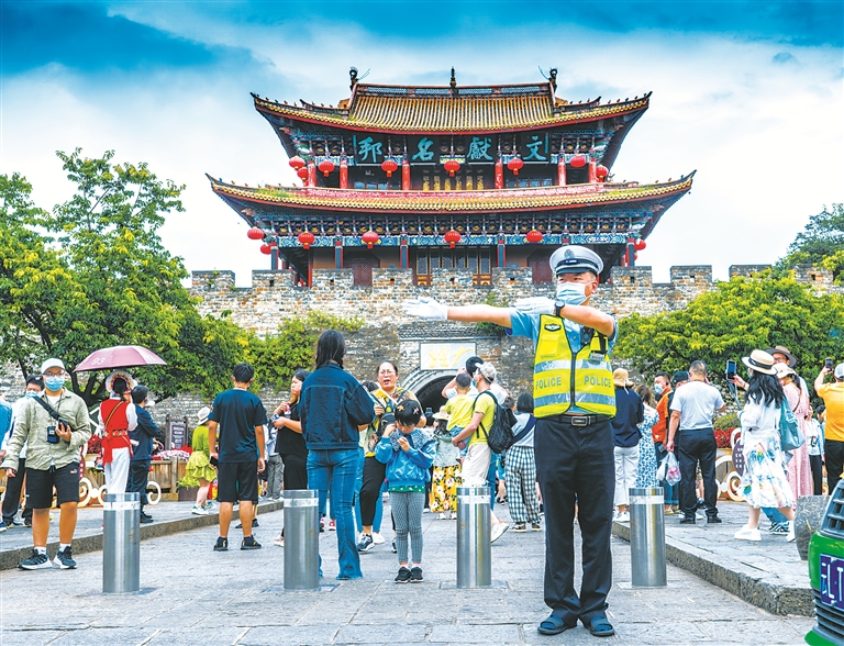 大理州公安局交通警察支队深入推进以案促改工作,紧盯交警队伍在服务群众中存在的问题,进一步规范交警执勤执法行为。图为大理市执勤交警在大理古城景区定点值守,为群众营造安全畅通的道路交通环境。赵渝 摄
